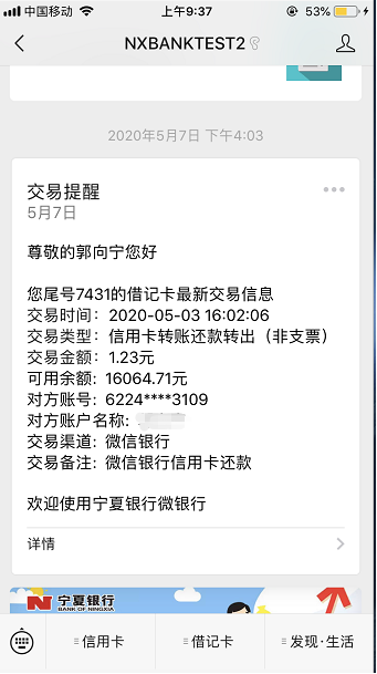 寧夏銀行微信借記卡動(dòng)賬通知便捷上線(xiàn)!
