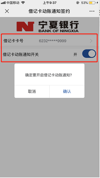 確定是否要開(kāi)啟借記卡動(dòng)賬通知?
